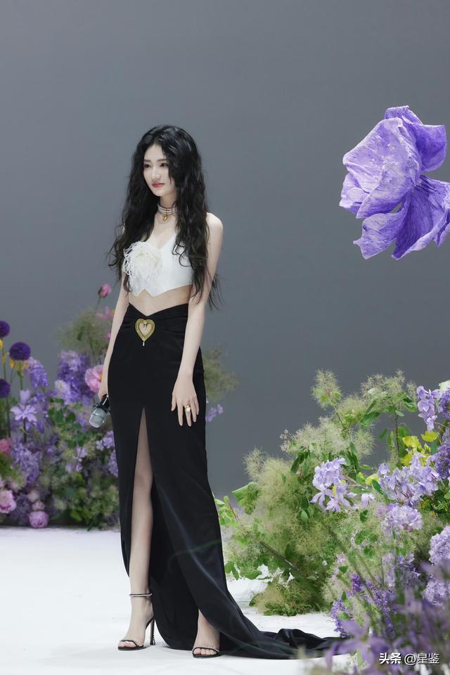 下装搭配的黑色高开叉鱼尾裙,把女人味拉到极致。高腰设计+心形金属腰饰,不仅掐出了纤细腰线,还让整体造型多了几分精致复古感,高开叉的设计刚好露出一截小腿,走路时自带摇曳感,既显腿长又不会过于张扬。